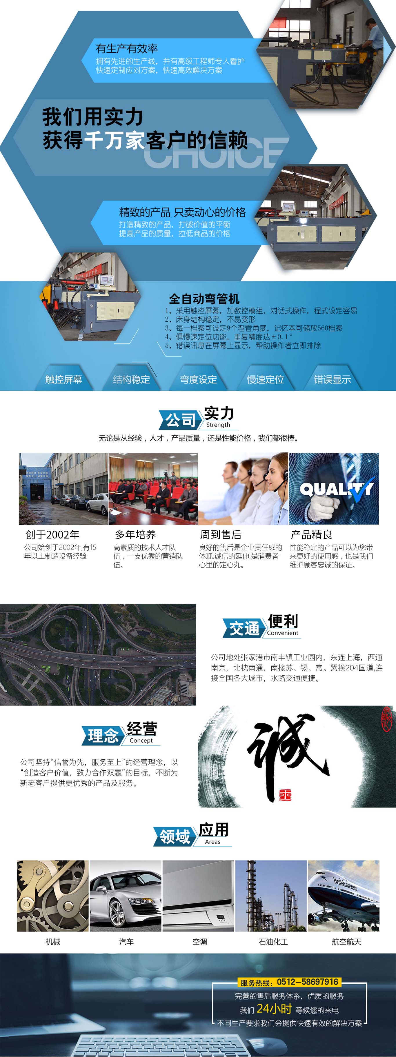 張家港市雙和機械制造有限公司始建于2001年,占地面積12000平方米,南鄰蘇州、無錫、上海,東鄰常州、南京,交通便利,位長三角中間地段,風景優(yōu)美的張家港。 雙和公司至創(chuàng)立開始,引進了國外的設(shè)計制造理念,組建了企業(yè)生產(chǎn)管理優(yōu)秀團隊,致力于管材加工機械研發(fā)、設(shè)計、制造。創(chuàng)新的設(shè)計理念,嚴格的質(zhì)量把關(guān),專業(yè)的售后服務,不斷提升了我在整個行業(yè)的影響力。 雙和公司生產(chǎn)的系列產(chǎn)品分為彎管機、切管機、縮管機、磨齒機、伺服彎管機、數(shù)控彎管機、液壓彎管機、自動切管機、管端成型機、倒角機、大弧滾圓機、鋁切機、壓彎機等管材加工機械,廣泛用于航天業(yè)、造船業(yè)、汽車制造、鍋爐制造、自行車、摩托車、體育健身器材、管制品家...